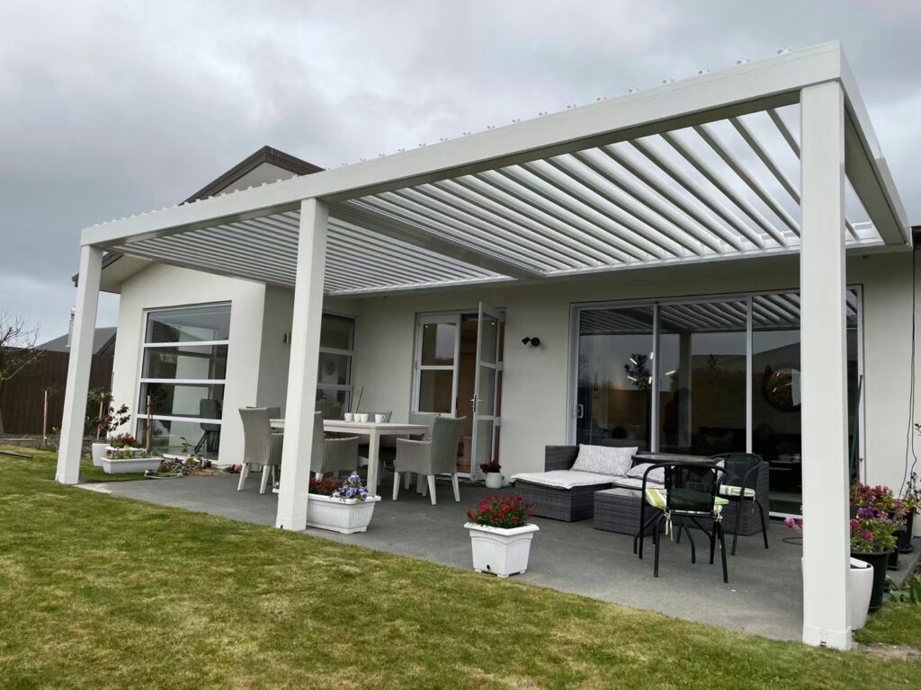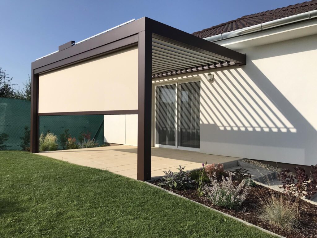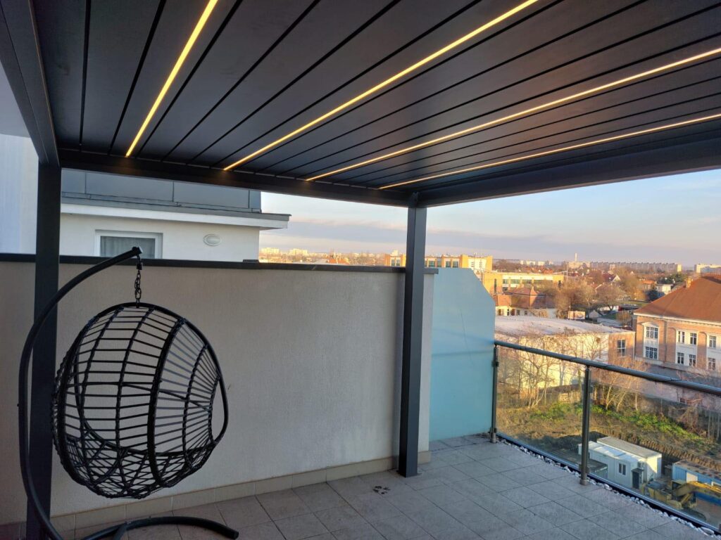 Teljes mértékben vízzáró, alumínium szerkezetű billenthető lamellás pergola, amely modern megoldást kínál a terasz lefedésére.